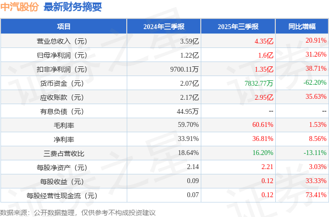 据证券之星公开数据整理,近期中汽股份(301215)发布2025年三季报。截至本报告期末,公司营业总收入4.35亿元,同比上升20.91%,归母净利润1.6亿元,同比上升31.26%。按单季度数据看,第三季度营业总收入2.22亿元,同比上升18.09%,第三季度归母净利润7493.9万元,同比上升56.12%。本报告期中汽股份应收账款上升,应收账款同比增幅达35.63%。