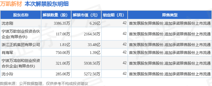 证券之星消息,根据市场公开信息整理,万凯新材(301216)于9月29日将有2.3亿股限售股份解禁,为公司首发原股东限售股份,追加承诺限售股份上市流通,占公司总股本40.9%。(本次数据根据历史公告整理得出,实际情况以上市公司最新公告为准)本次解禁后,公司还有84.38万股限售股份,占总股本0.15%。具体如下图所示: