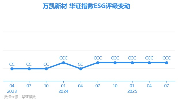 日前,华证指数公布了新一期(2025年7月31日)的ESG评级结果,万凯新材(301216.SZ)获得CCC评级(华证指数评级为C起至AAA九档,C为最低档,AAA为其最高一级评级/AA为其第二档),上一期(2025年4月30日)ESG评级为CCC。本期ESG评级在462家化学制品行业A股上市公司中排名第343(上一期排名第359)。