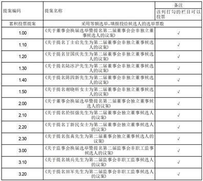 ③选举非职工监事(如提案3,应选人数为2位),股东所拥有的选举票数=股东所代表的有表决权的股份总数×2,股东可以在2位非职工监事候选人中将其拥有的选举票数任意分配,但投票总数不得超过其拥有的选举票数。