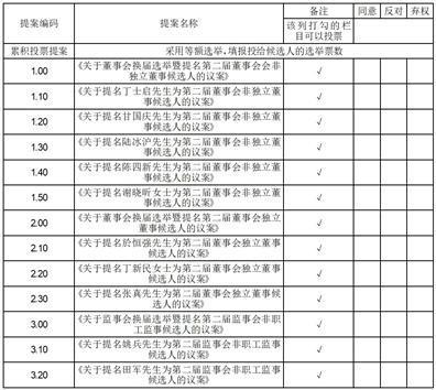 2.填报表决意见或选举票数。本次股东大会议案均为累积投票提案,填报表决意见:同意、反对、弃权。