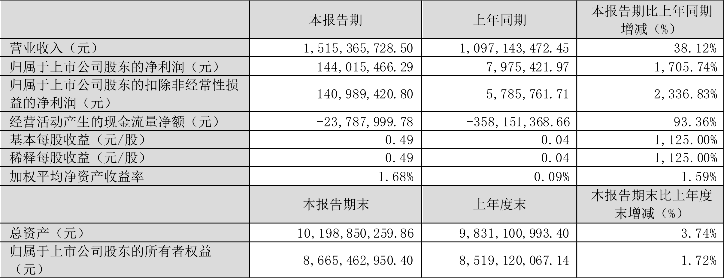 2024年第一季度,公司经营活动现金流净额为-2378.80万元,同比增加3.34亿元;筹资活动现金流净额1.77亿元,同比增加2.89亿元;投资活动现金流净额-1.49亿元,上年同期为-1.78亿元。