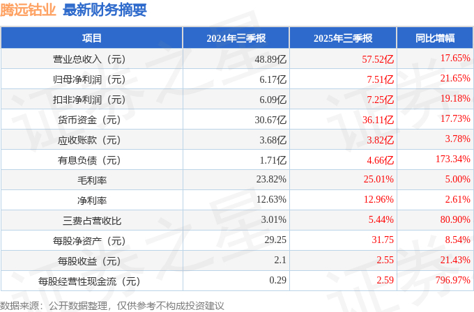 据证券之星公开数据整理,近期腾远钴业(301219)发布2025年三季报。截至本报告期末,公司营业总收入57.52亿元,同比上升17.65%,归母净利润7.51亿元,同比上升21.65%。按单季度数据看,第三季度营业总收入22.19亿元,同比上升31.6%,第三季度归母净利润2.82亿元,同比上升47.84%。本报告期腾远钴业盈利能力上升,毛利率同比增幅5%,净利率同比增幅2.61%。