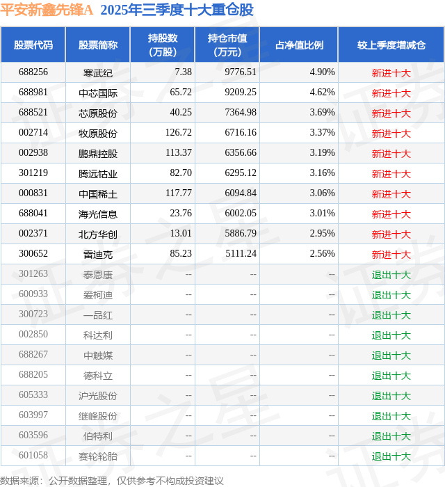 根据2025基金Q3季报公募基金重仓股数据,重仓该股的公募基金共7家,其中持有数量最多的公募基金为平安基金的平安新鑫先锋A。平安新鑫先锋A目前规模为8.51亿元,最新净值2.621(11月12日),较上一交易日下跌0.42%,近一年上涨22.77%。该公募基金现任基金经理为张晓泉。张晓泉在任的基金产品包括:平安研究精选混合A,管理时间为2021年5月25日至今,期间收益率为27.13%;平安研究优选混合A,管理时间为2023年3月21日至今,期间收益率为32.25%;平安新鑫优选混合A,管理时间为2023年8月15日至今,期间收益率为45.48%。