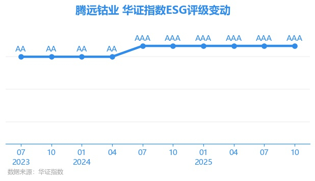 日前,华证指数公布了新一期(2025年10月31日)的ESG评级结果,腾远钴业(301219.SZ)获得AAA评级(华证指数评级为C起至AAA九档,C为最低档,AAA为其最高一级评级/AA为其第二档),上一期(2025年7月31日)ESG评级为AAA。本期ESG评级在206家金属与采矿行业A股上市公司中排名第2(上一期排名第2)。