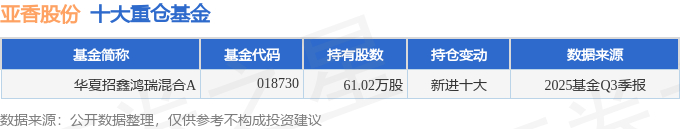 持有亚香股份最多的基金为华夏招鑫鸿瑞混合A,目前规模为2.79亿元,最新净值2.0674(10月30日),较上一交易日下跌0.91%,近一年上涨66.97%。该基金现任基金经理为钟帅。