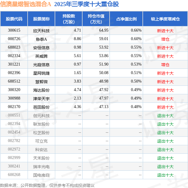 信澳星煜智选混合A的前十大重仓股如下: