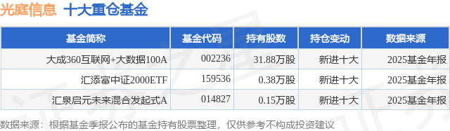 根据2025基金年报公募基金重仓股数据,重仓该股的公募基金共3家,其中持有数量最多的公募基金为大成基金的大成360互联网+大数据100A。大成360互联网+大数据100A目前规模为7.54亿元,最新净值3.6327(3月2日),较上一交易日下跌2.92%,近一年上涨42.12%。该公募基金现任基金经理为夏高。夏高在任的基金产品包括:大成沪深300增强发起式A,管理时间为2021年2月23日至今,期间收益率为1.18%;大成动态量化配置策略混合A,管理时间为2023年4月14日至今,期间收益率为31.02%;大成中证500指数增强A,管理时间为2024年7月19日至今,期间收益率为73.75%。