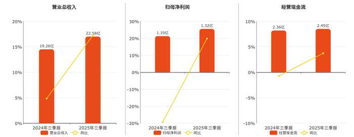 公司营业总收入为22.58亿元。归母净利润为1.32亿元。经营活动现金净流入为2.45亿元。
