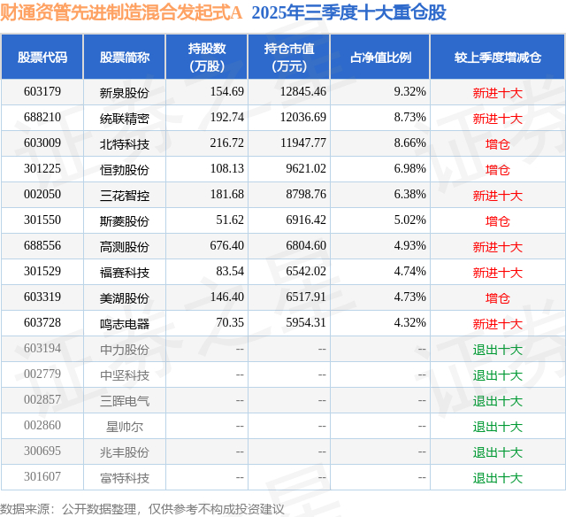 根据2025基金Q3季报公募基金重仓股数据,重仓该股的公募基金共5家,其中持有数量最多的公募基金为财通资管的财通资管先进制造混合发起式A。财通资管先进制造混合发起式A目前规模为1.94亿元,最新净值2.0818(12月31日),较上一交易日上涨0.78%。该公募基金现任基金经理为徐竞择。