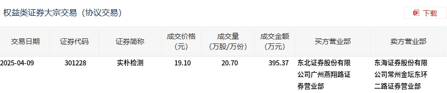实朴检测今日大宗交易折价成交20.7万股,成交额395.37万元