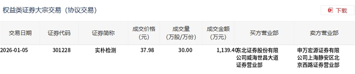 实朴检测今日大宗交易折价成交30万股,成交额1139.4万元