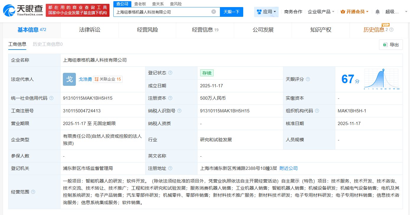 每经AI快讯,天眼查App显示,近日,上海纽泰格机器人科技有限公司成立,法定代表人为戈浩勇,注册资本500万元人民币,经营范围包括智能机器人的研发、工程和技术研究和试验发展、服务消费机器人销售、工业机器人销售等。股权全景穿透图显示,该公司由纽泰格(301229)旗下江苏纽泰格机器人科技有限公司全资持股。