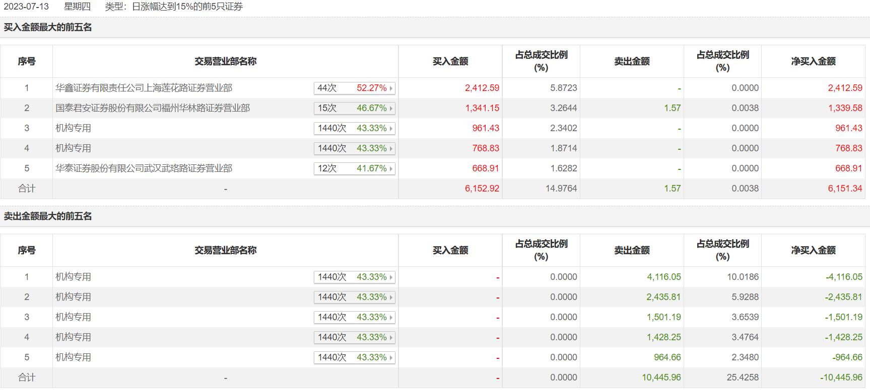 泓博医药7月13日涨停,龙虎榜数据显示,上榜营业部席位全天成交1.66亿元,占当日总成交金额比例为40.41%。其中,买入金额为6152.92万元,卖出金额为1.04亿元,合计净卖出4294.62万元。