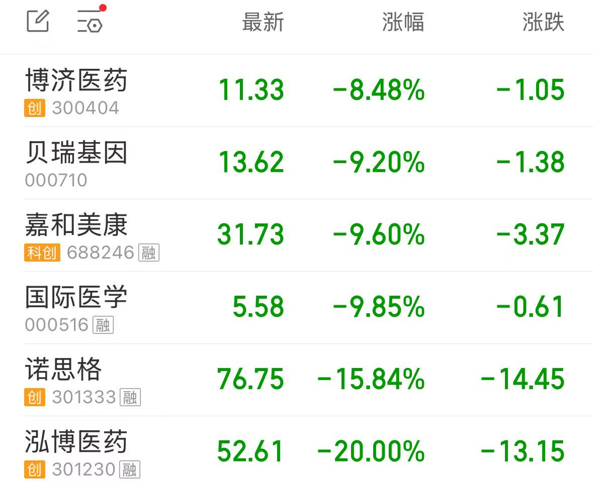 据同花顺数据,截止发稿,泓博医药(301230.SZ)盘中触及跌停,诺思格(301333.SZ)跌超16%,国际医学(000516.SZ)、博济医药(300404.SZ)、嘉和美康(688246.SH)、贝瑞基因(000710.SZ)等均跌逾9%。