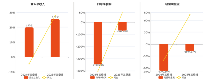 公司营业总收入为2.52亿元。归母净利润为-509.49万元。经营活动现金净流入为-1504.17万元。