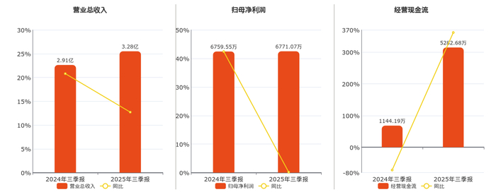 公司营业总收入为3.28亿元。归母净利润为6771.07万元。经营活动现金净流入为5282.68万元。