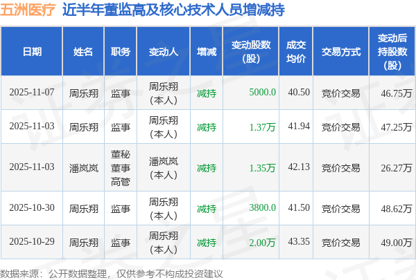 证券之星消息,根据11月10日市场公开信息、上市公司公告及交易所披露数据整理,五洲医疗(301234)最新董监高及相关人员股份变动情况:2025年11月7日公司监事周乐翔共减持公司股份5000.0股,占公司总股本为0.0074%。变动期间公司股价下跌1.19%,11月7日当日收盘报39.94元。