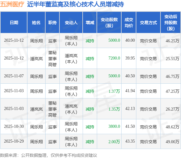 五洲医疗近半年内的董监高及核心技术人员增减持详情如下: