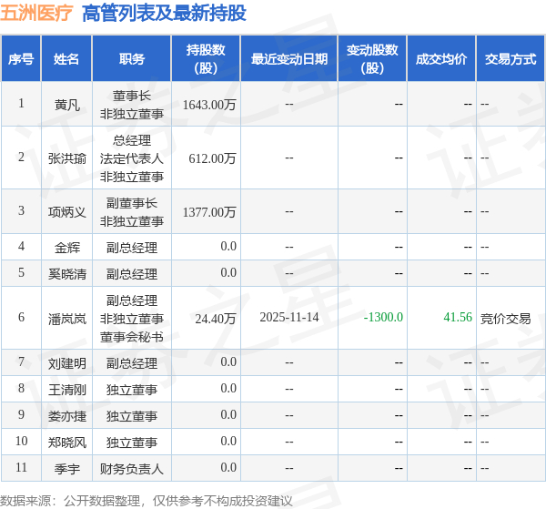 五洲医疗的高管列表及最新持股情况如下: