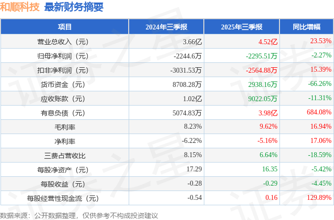 据证券之星公开数据整理,近期和顺科技(301237)发布2025年三季报。截至本报告期末,公司营业总收入4.52亿元,同比上升23.53%,归母净利润-2295.51万元,同比下降2.27%。按单季度数据看,第三季度营业总收入1.56亿元,同比上升15.97%,第三季度归母净利润-864.17万元,同比上升48.55%。本报告期和顺科技盈利能力上升,毛利率同比增幅16.94%,净利率同比增幅17.06%。