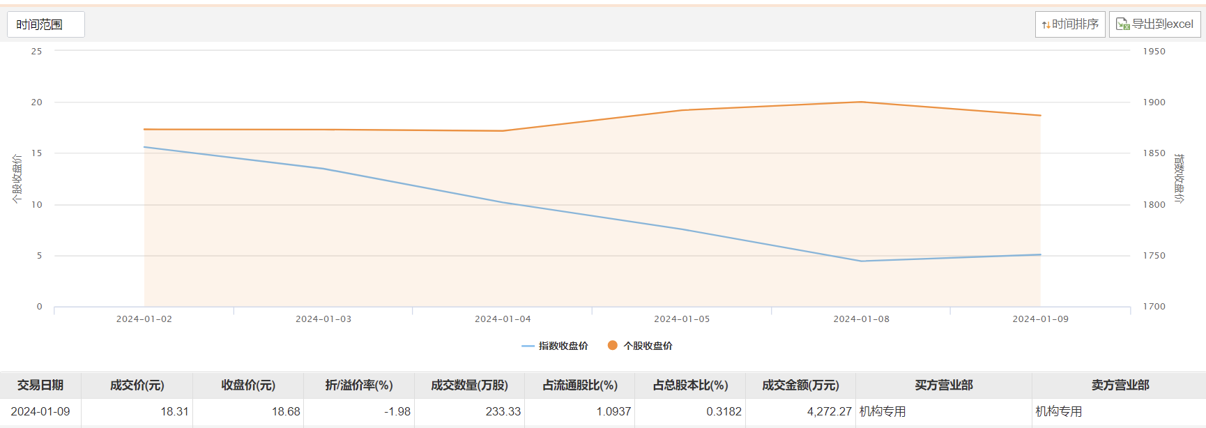 今日大宗交易成交233.33万股,成交额4272.27万元,占当日总成交额的8.07%,成交价18.31元,较市场收盘价折价1.98%。
