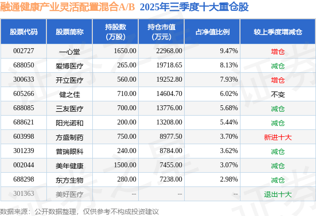 根据2025基金Q3季报公募基金重仓股数据,重仓该股的公募基金共5家,其中持有数量最多的公募基金为融通基金的融通健康产业灵活配置混合A/B。融通健康产业灵活配置混合A/B目前规模为18.16亿元,最新净值2.627(12月30日),较上一交易日下跌0.38%,近一年上涨6.27%。该公募基金现任基金经理为万民远。万民远在任的基金产品包括:融通鑫新成长混合A,管理时间为2021年10月8日至今,期间收益率为25.76%;融通价值成长混合A,管理时间为2022年7月18日至今,期间收益率为20.23%;融通医疗保健行业混合A/B,管理时间为2023年3月15日至今,期间收益率为-23.93%。
