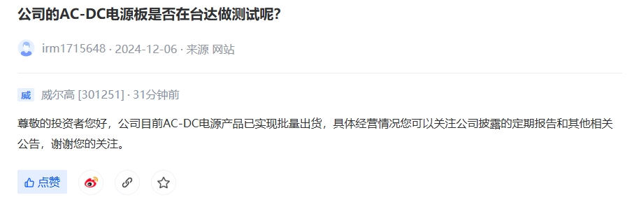 中国财富通12月18日 - 威尔高(301251)在互动平台上表示,公司目前AC-DC电源产品已实现批量出货。