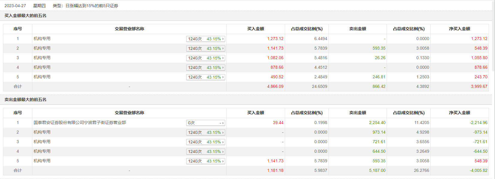4月27日,普蕊斯今日涨停,龙虎榜数据显示,上榜营业部席位全天成交1.04亿元,占当日总成交金额比例为52.51%。其中,买入金额为4905.53万元,卖出金额为5460.07万元,合计净卖出554.54万元。