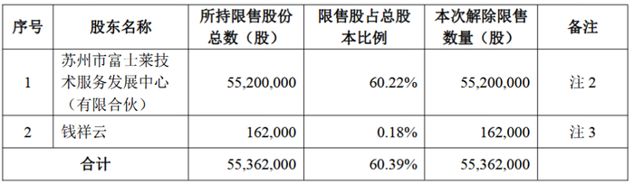 9月24日,富士莱(301258)发布公告,公司的2名股东所持5536万股首次公开发行前已发行限售股将于2025年9月29日上市流通,占公司总股本的60.3927%。