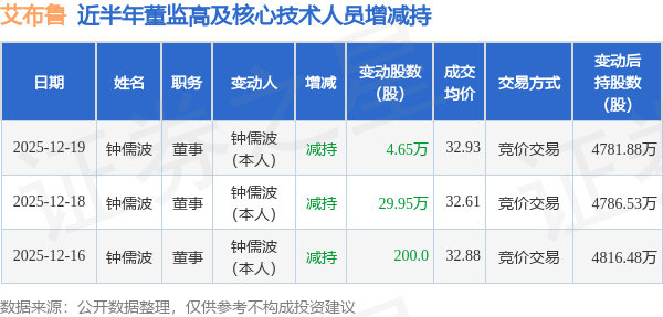 艾布鲁:12月19日高管钟儒波减持股份合计4.65万股