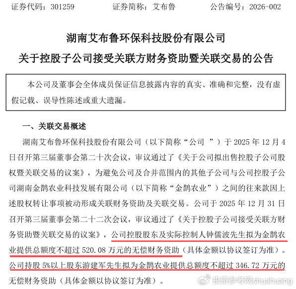 2026年1月6日,农村环保领域上市公司艾布鲁(301259)披露的一则关联交易公告引发市场关注:公司控股股东、实控人钟儒波与持股5%以上股东游建军,拟合计向控股子公司金鹊农业提供不超过867万元的无偿财务资助。这一动作紧承上月的股权交割计划,在公司2025年前三季度仍未实现整体扭亏但亏损大幅收窄的背景下,两大股东的"真金白银"注入,被解读为优化子公司治理、助力主体业务聚焦的关键布局。