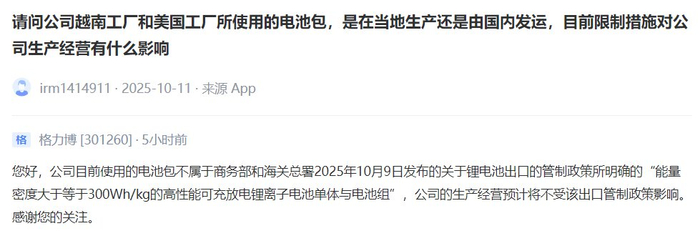 来源:深交所互动易【V观财报|格力博:公司目前使用的电池包不属于出口管制范围】格力博10月15日在投资者互动平台表示,公司目前使用的电池包不属于商务部和海关总署2025年10月9日发布的关于锂电池出口的管制政策所明确的“能量密度大于等于300Wh/kg的高性能可充放电锂离子电池单体与电池组”,公司的生产经营预计将不受该出口管制政策影响。(中新经纬APP)