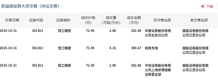 10月31日,恒工精密大宗交易成交9.75万股,成交额706.39万元,占当日总成交额的5.04%,成交价72.45元,较市场收盘价80.5元折价10%。