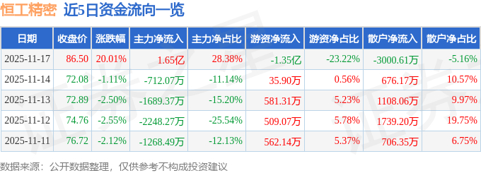 证券之星消息,恒工精密11月17日涨停收盘,收盘价86.5元。该股于14点38分涨停,2次打开涨停,截止收盘封单资金为4232.01万元,占其流通市值1.31%。