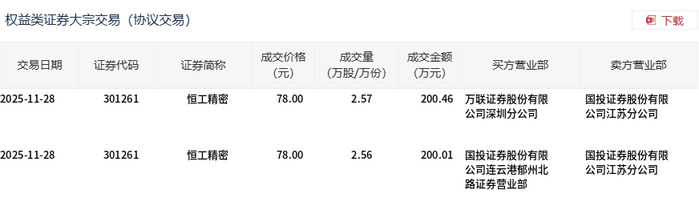 11月28日,恒工精密大宗交易成交5.13万股,成交额400.47万元,占当日总成交额的0.82%,成交价78元,较市场收盘价89.14元折价12.5%。