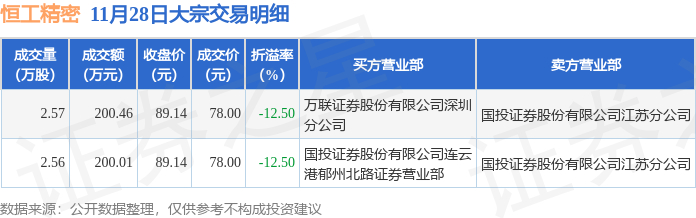 11月28日恒工精密现2笔折价12.5%的大宗交易 合计成交400.47万元