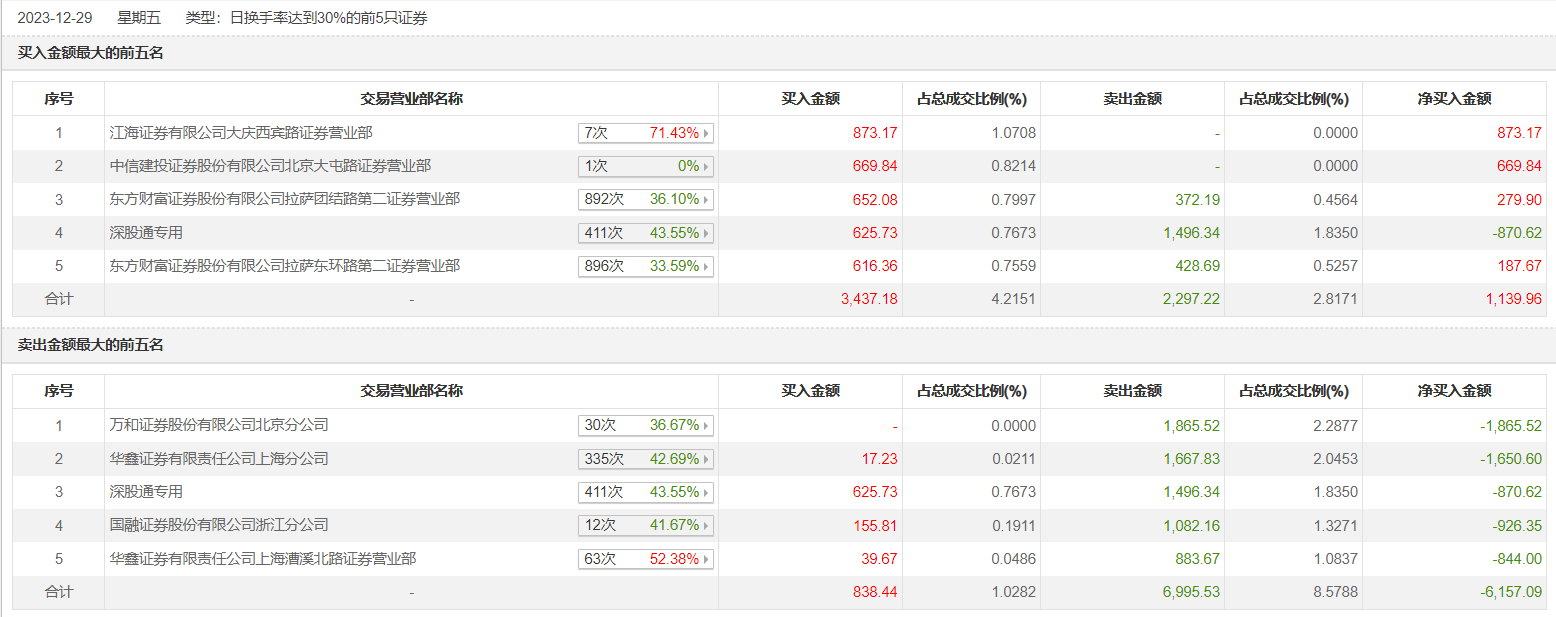 宇邦新材12月29日涨8.08%,全天换手率达38.94%,振幅达12.71%。龙虎榜数据显示,营业部席位合计净卖出4146.51万元。其中,江海证券有限公司大庆西宾路证券营业部、中信建投证券北京大屯路证券营业部分别买入873.17万元、669.84万元;万和证券北京分公司、华鑫证券上海分公司分别卖出1865.52万元、1667.83万元。
