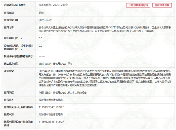 中国经济网北京12月29日讯 信用中国网站显示,仙游华厦眼科医院有限公司信用信息新增一篇行政处罚决定书(仙市监处罚﹝2025﹞293号)。2025年9月10日,仙游县市场监督管理局接到福建省广告监测平台移交的违法广告线索,反映仙游华厦眼科医院有限公司在微信“仙游华厦眼科”服务号发布违法广告。