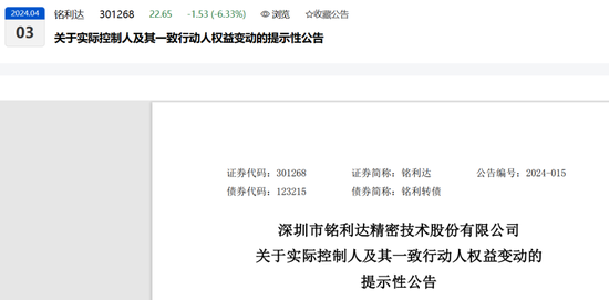 2024-04-03铭利达[301268]:关于实际控制人及其一致行动人权益变动的提示性公告