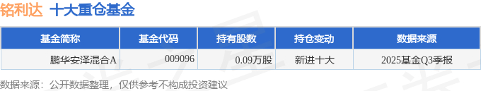 持有铭利达最多的基金为鹏华安泽混合A,目前规模为0.13亿元,最新净值1.2047(10月29日),较上一交易日上涨0.07%,近一年上涨2.75%。该基金现任基金经理为祝松 时赟超 张静娴。