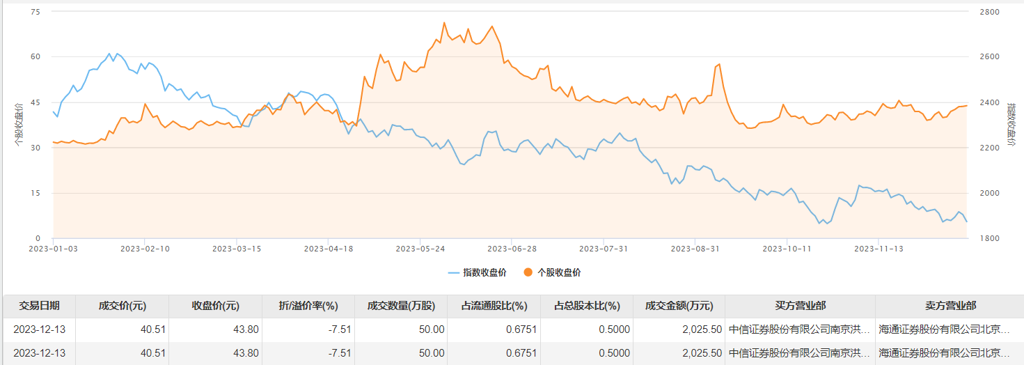 12月13日大宗交易成交100万股,成交额4051万元,占当日总成交额的6.51%,成交价40.51元,较市场收盘价折价7.51%。
