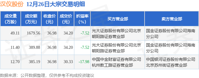 证券之星消息,12月26日汉仪股份发生大宗交易,交易数据如下: