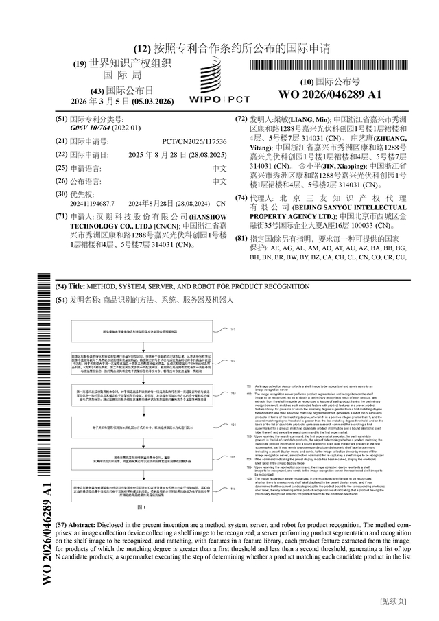 汉朔科技公布国际专利申请:“商品识别的方法、系统、服务器及机器人”