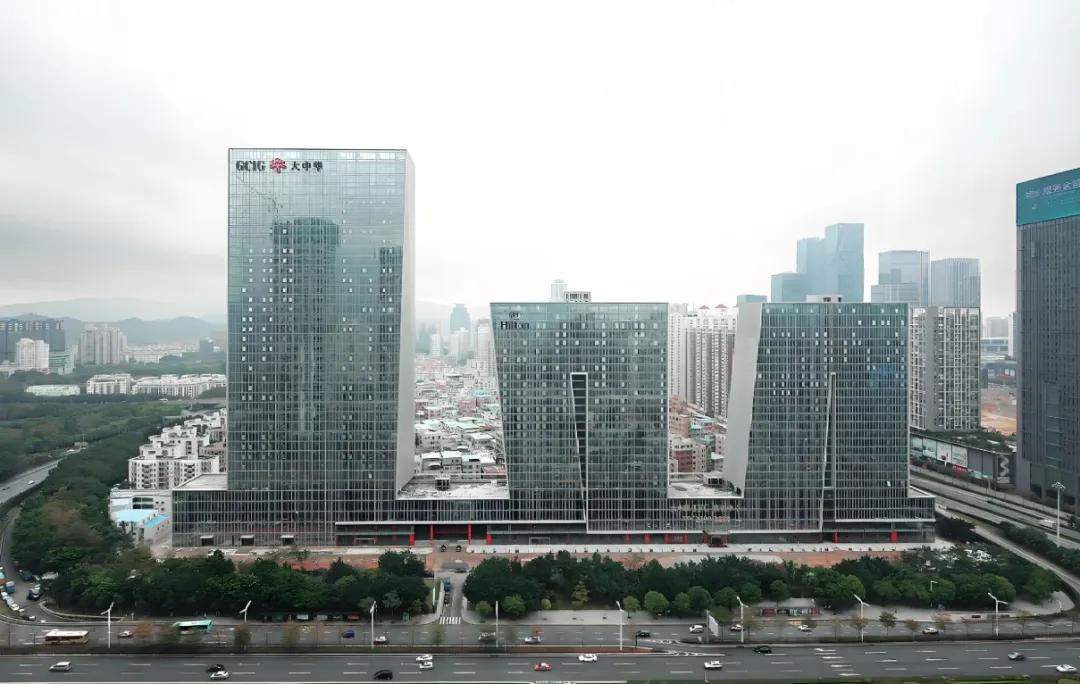 :四栋建筑沿街连体,形成半围合街区,流动几何界面点亮福田CBD天际线。