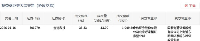金道科技今日大宗交易折价成交33万股,成交额1099.89万元