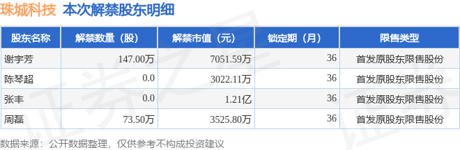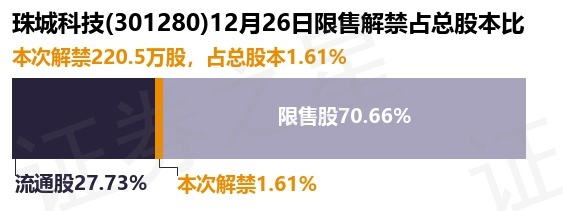 珠城科技(301280)220.5万股限售股将于12月26日解禁,占总股本1.61%