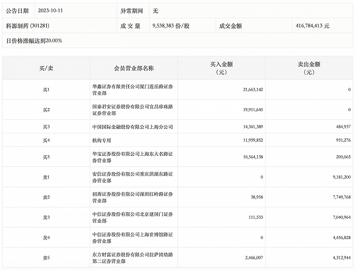 10月11日,科源制药今日涨停,全天换手率达37.13%,振幅达21.15%。龙虎榜数据显示,营业部席位合计净买入4671.87万元。其中,机构买入1195.99万元,卖出93.13万元,合计净买入1102.86万元。此外,华鑫证券厦门莲岳路证券营业部、国泰君安证券宜昌珍珠路证券营业部分别买入2166.31万元、1991.16万元;安信证券重庆洪湖东路证券营业部、招商证券深圳红岭路证券营业部分别卖出918.12万元、774.98万元。