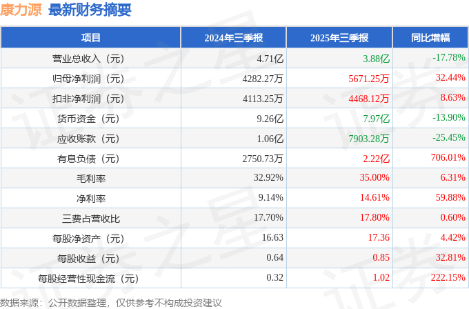 据证券之星公开数据整理,近期康力源(301287)发布2025年三季报。截至本报告期末,公司营业总收入3.88亿元,同比下降17.78%,归母净利润5671.25万元,同比上升32.44%。按单季度数据看,第三季度营业总收入1.35亿元,同比下降16.66%,第三季度归母净利润2742.88万元,同比上升115.16%。本报告期康力源盈利能力上升,毛利率同比增幅6.31%,净利率同比增幅59.88%。