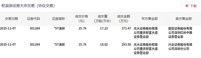 11月7日,*ST清研大宗交易成交35.85万股,成交额564.97万元,占当日总成交额的21.17%,成交价15.76元,较市场收盘价17.32元折价9.01%。